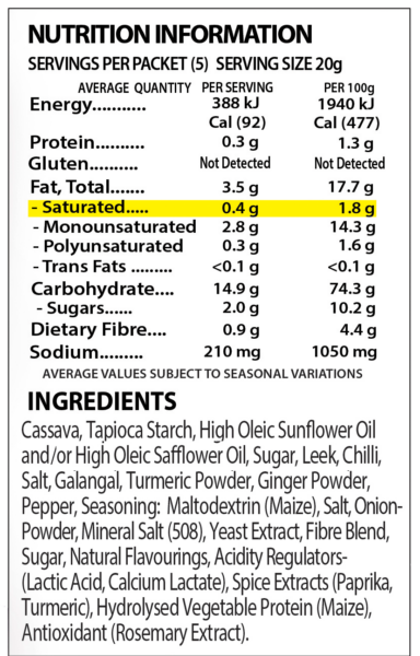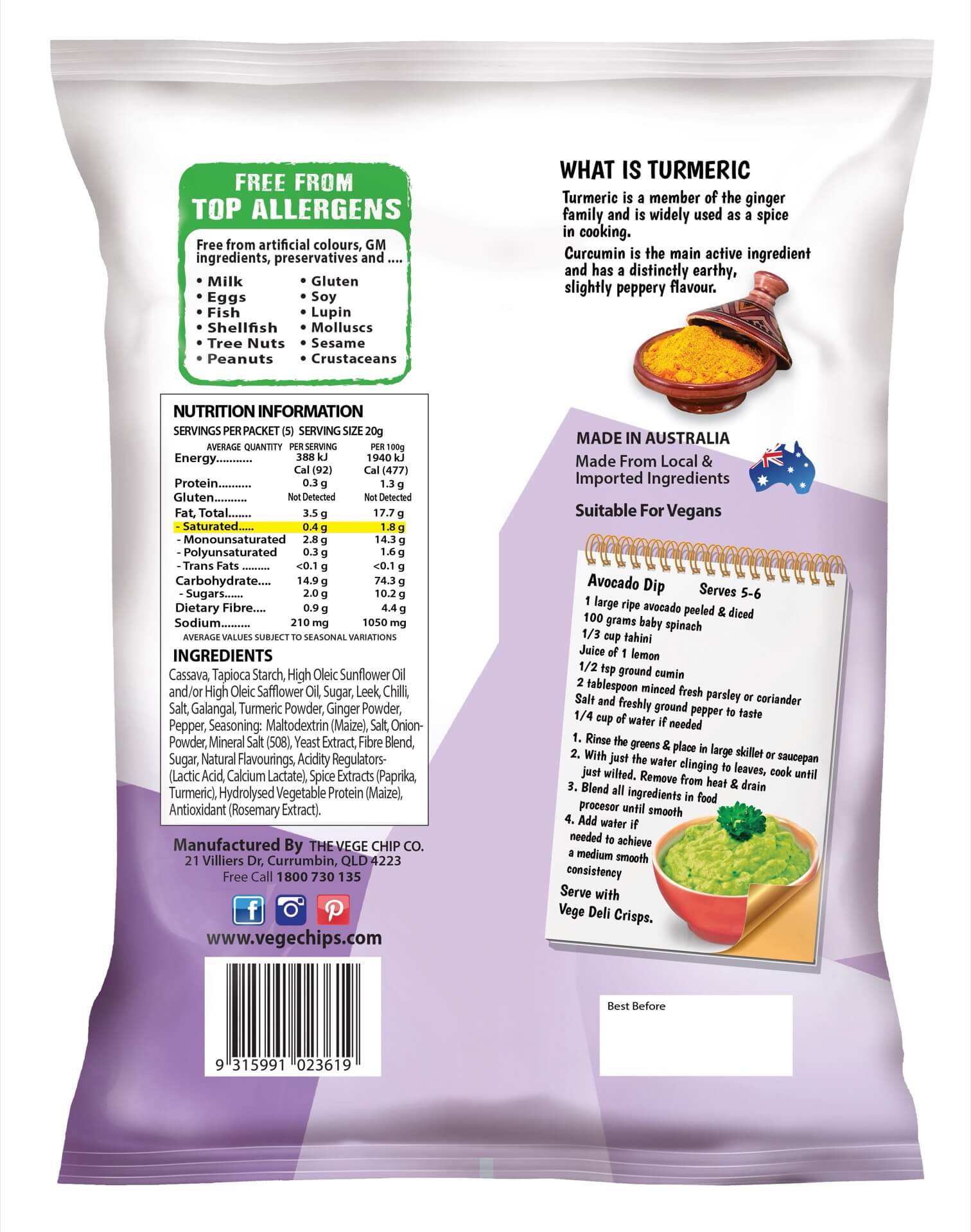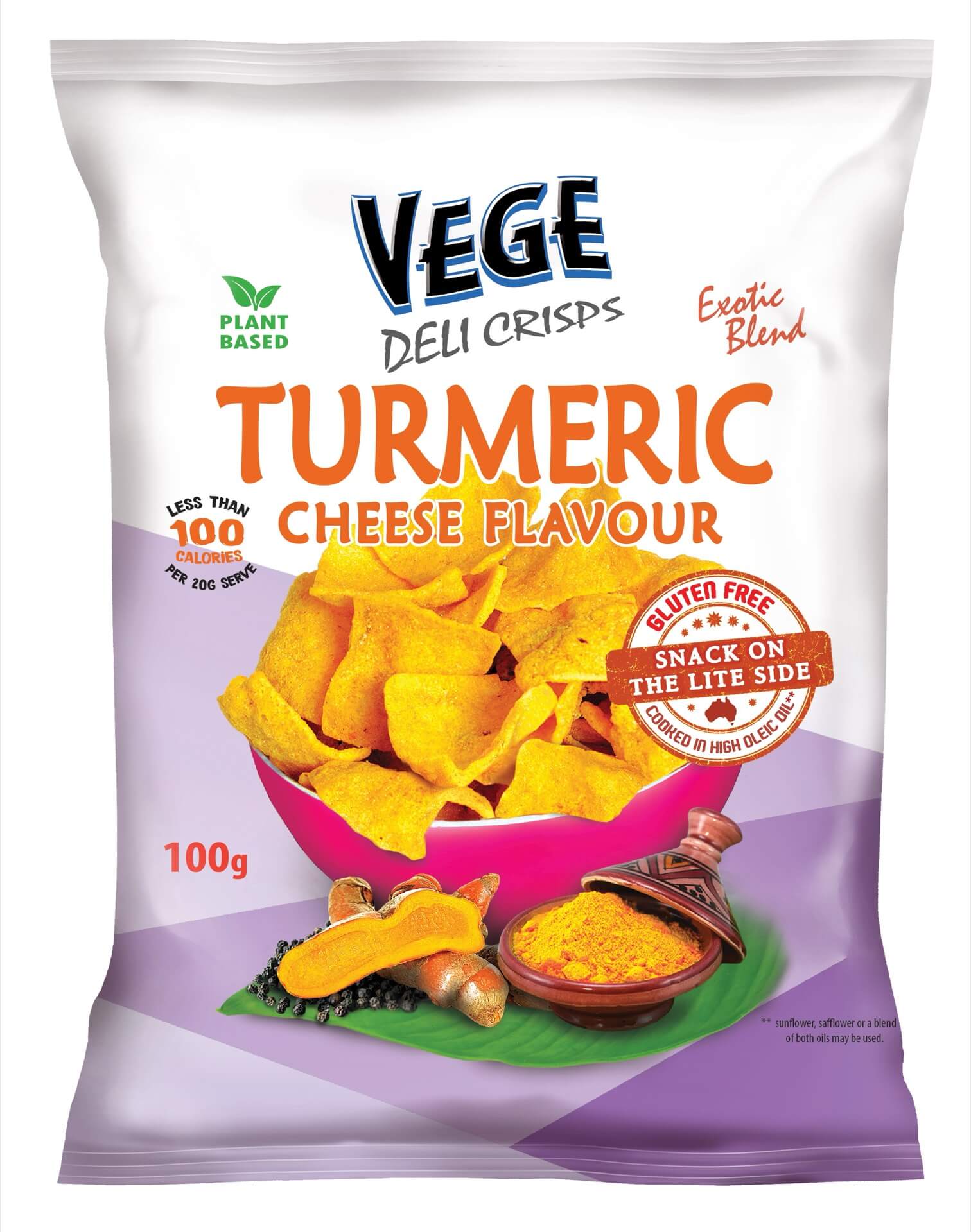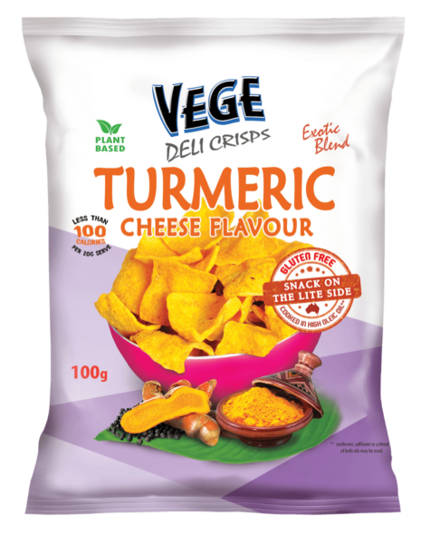 Deli ‘Turmeric & Cheese’ Crisps are a gourmet taste in a Gluten Free crisp. A crunchy chip with a subtle aromatic flavour of turmeric and now made with our new vegan friendly cheese flavouring!.