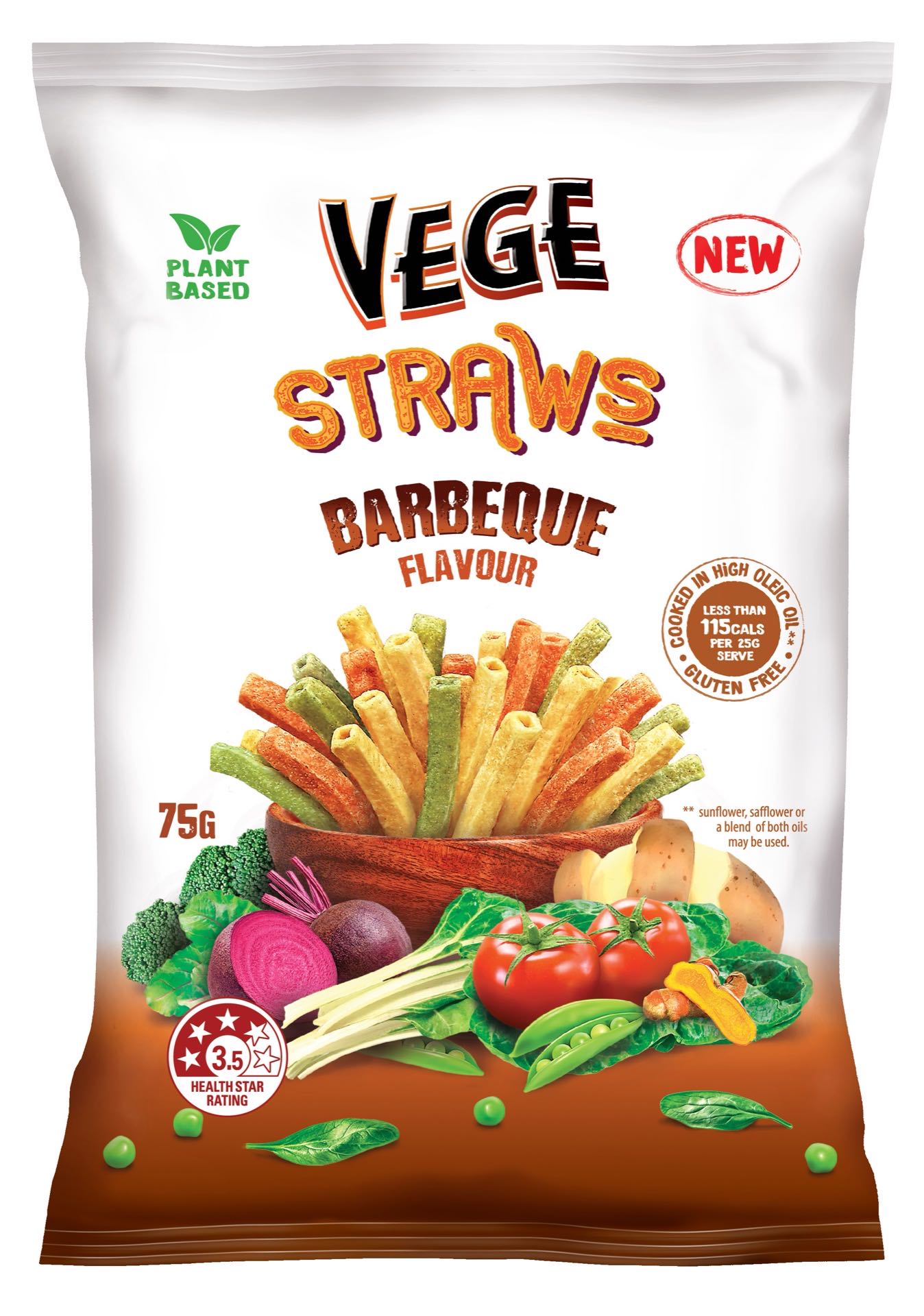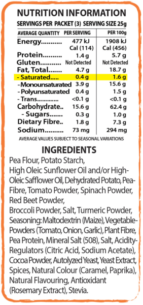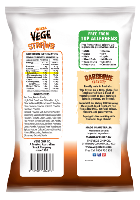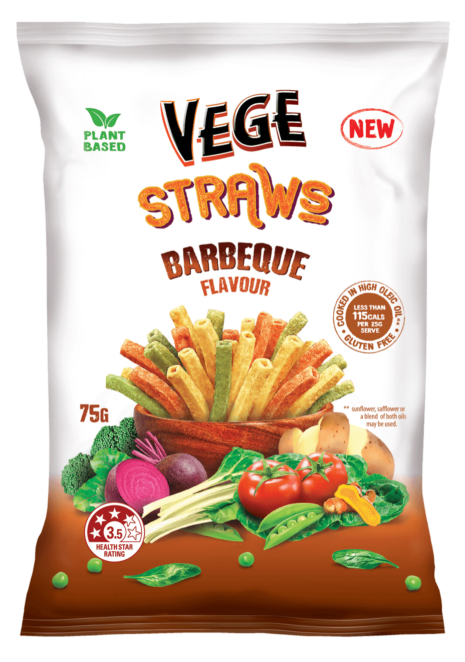 Proudly made in Australia, Vege Straws are a tasty, gluten-free snack crafted from a blend of vegetables like peas, tomatoes, spinach, potatoes, and broccoli.
