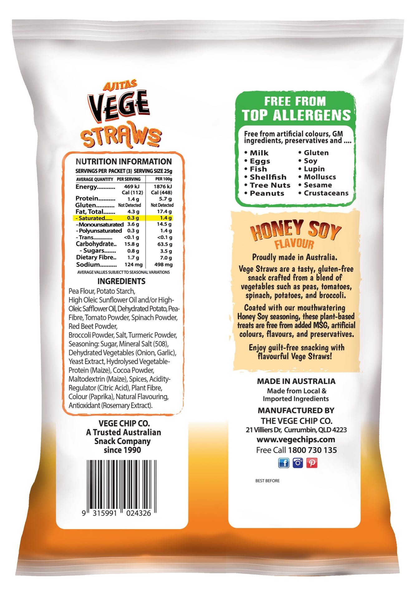 Proudly made in Australia, Vege Straws are a tasty, gluten-free snack crafted from a blend of vegetables like peas, tomatoes, spinach, potatoes, and broccoli.