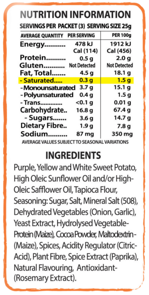 Vege Nibbles are slightly sweet, slightly savoury and always delicious. We use purple, orange and white varieties of sweet potatoes grown in nutrient-rich volcanic soils.